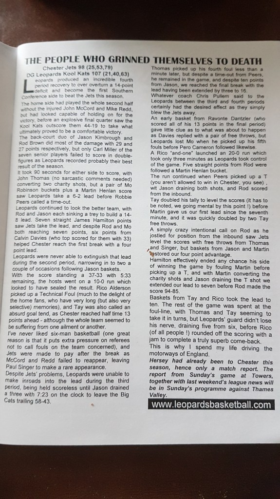 Chester dominated the first half and were helped with a 7-0 tear in the first and a 10-0 run in the second period to take the score out to 47-33, and ultimately lead 53-40 at the half. Jets lead right through until the final period where the Leopards went on a 18-2 run to tie the score at 81-81, and then took the lead in the dying minutes of the game to run out eventual winners. Calvin Davis led all scorers with an impressive 33-point haul, while Rod Brown bagged 29 points for the Leopards.