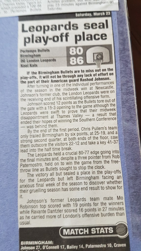 The Leopards led for much of the game after recovering from an early Rashod Johnson blitz who scored 12 to help Bullets to a 15-3 lead. Leopards held a crucial 80-77 lead going into the final minutes and despite a three pointer from Rob Paternostro held on to win the game from the charity stripe.