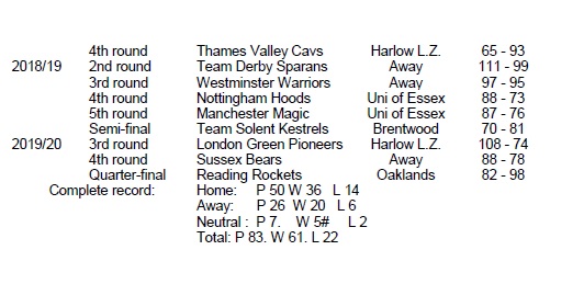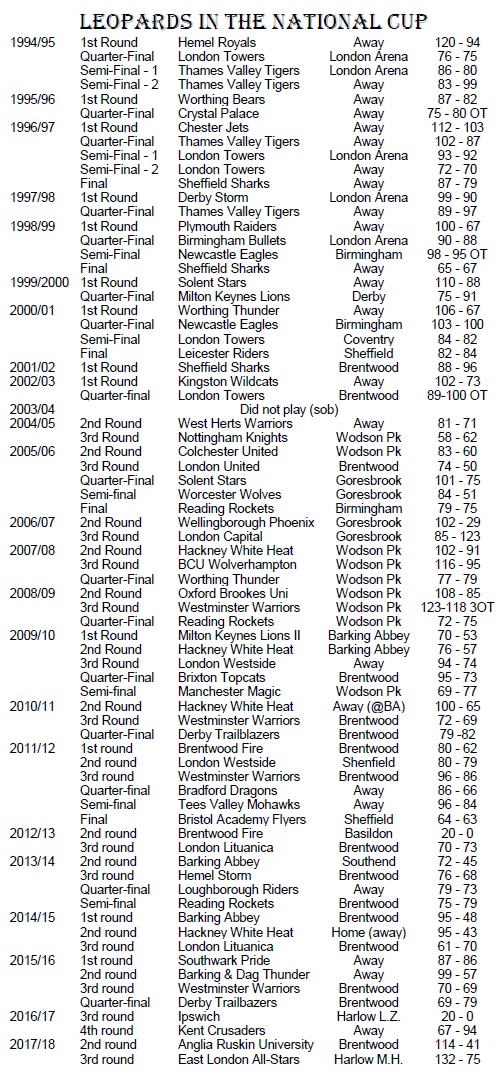 The last National Cup game played by the original Leopards came at the Brentwood Centre in November 2002 as old rivals London Towers won 100-89 but the oldest piece of silverware in English basketball obviously missed the Big Cats as in our absence it had been revamped. Throughout Leopards’ time in the BBL it had seen a handful of Division One clubs invited to make up numbers to 16 teams, but during Leopards’ year out the BBL clubs had departed to form their own competition following a row over import players, and the Cup now comprised of teams from all three national league divisions. As members of Division One, Leopards received a bye in the first round before they made their second debut in the competition with a win West Herts Warriors before losing to Division Two champions-elect Nottingham Knights at Wodson Park.