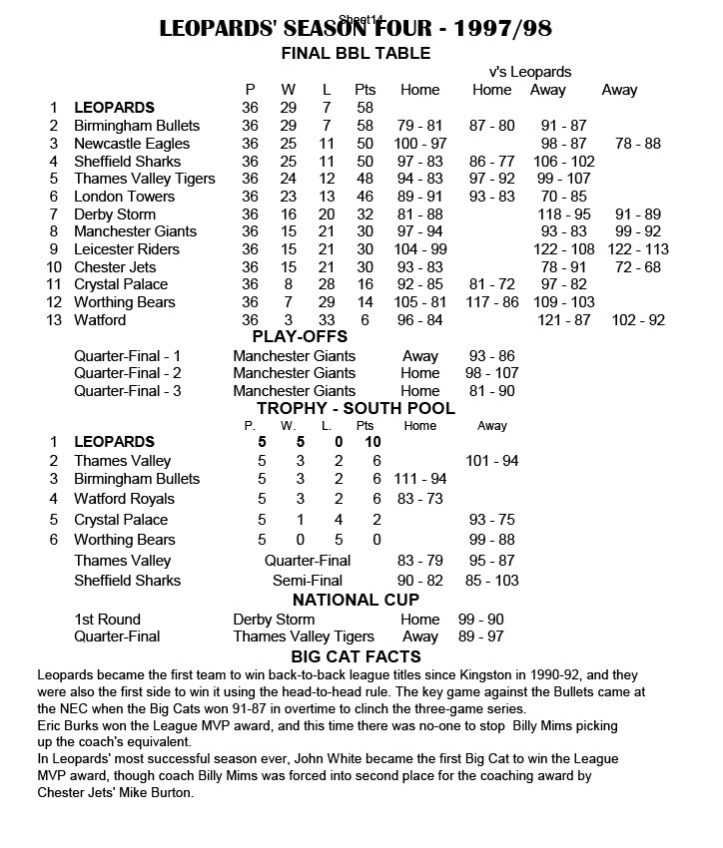 It’s always hard to follow up a successful season, but after winning the BBL regular season crown and the National Cup, the newly renamed adidas Greater London Leopards did a pretty good job in 1997/98 as they retained the league title in dramatic style.