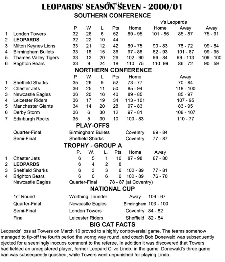 After the disappointment of the 1999/2000 campaign the first full season of the new millennium proved to be far more enjoyable for Leopards. Life was never dull with Bob Donewald coaching the Big Cats, it was a year that saw pretty much everything; Ejections, High Court injunctions, practice balls being poured all over the court mid-game, coaching via text messages from the balcony at Brentwood and footage of a crazy game at Crystal Palace that seems to reappear on A Question of Sport on a regular basis.
