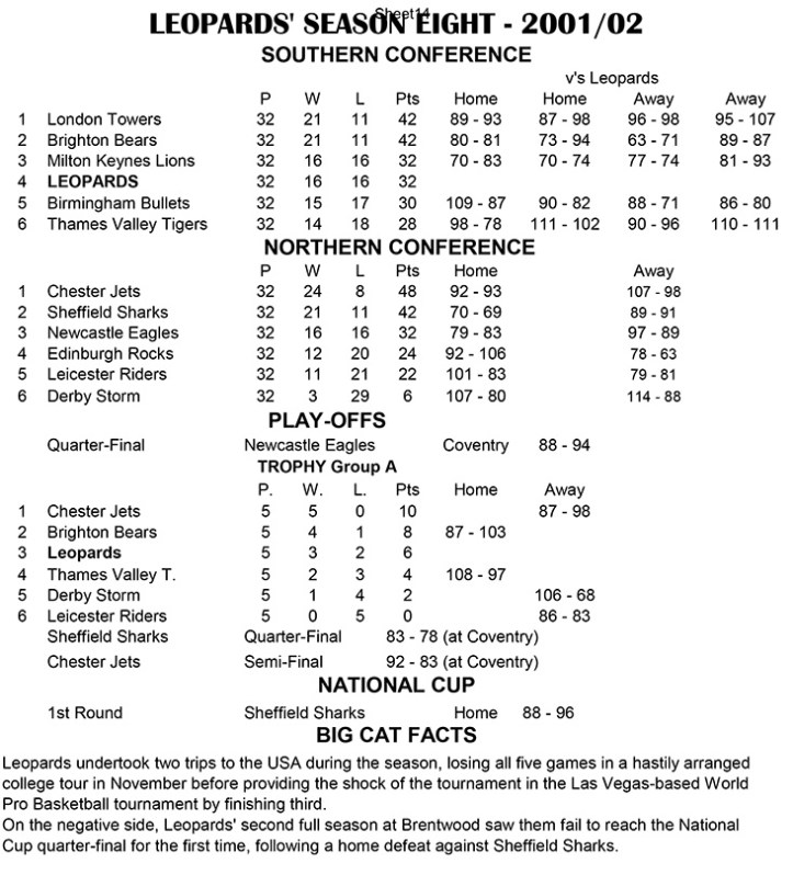 While big spending Towers and Brighton battled it out for the Southern Conference title, Leopards had looked a good bet for third place, but a poor end to the season saw the miss out to Milton Keyes on the head-to-head having lost three of their four games against the Lions. The following week saw the campaign end with another trip to Coventry where Leopards went down 94-88.